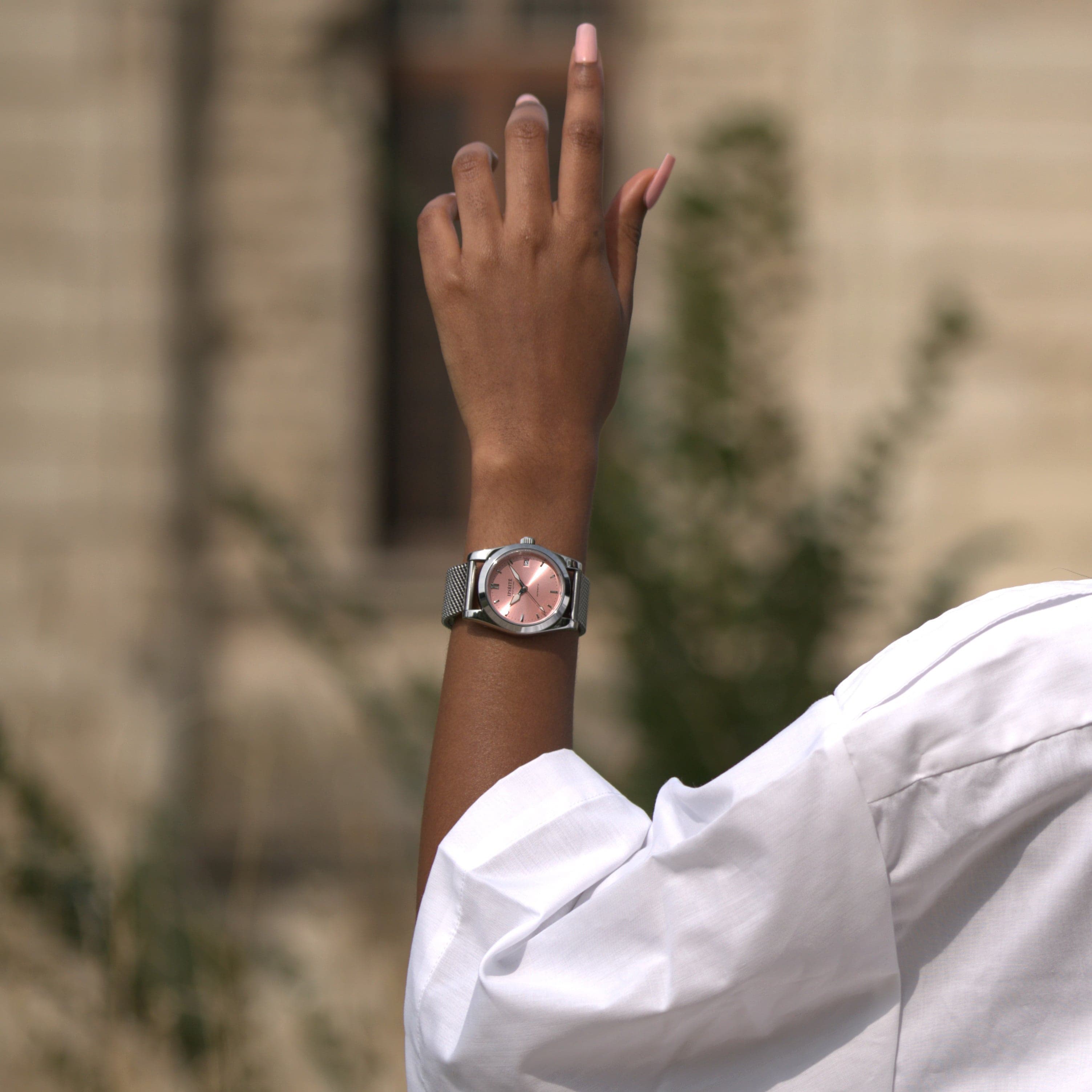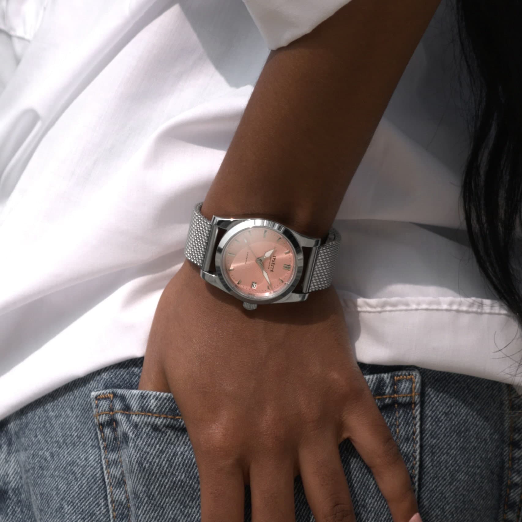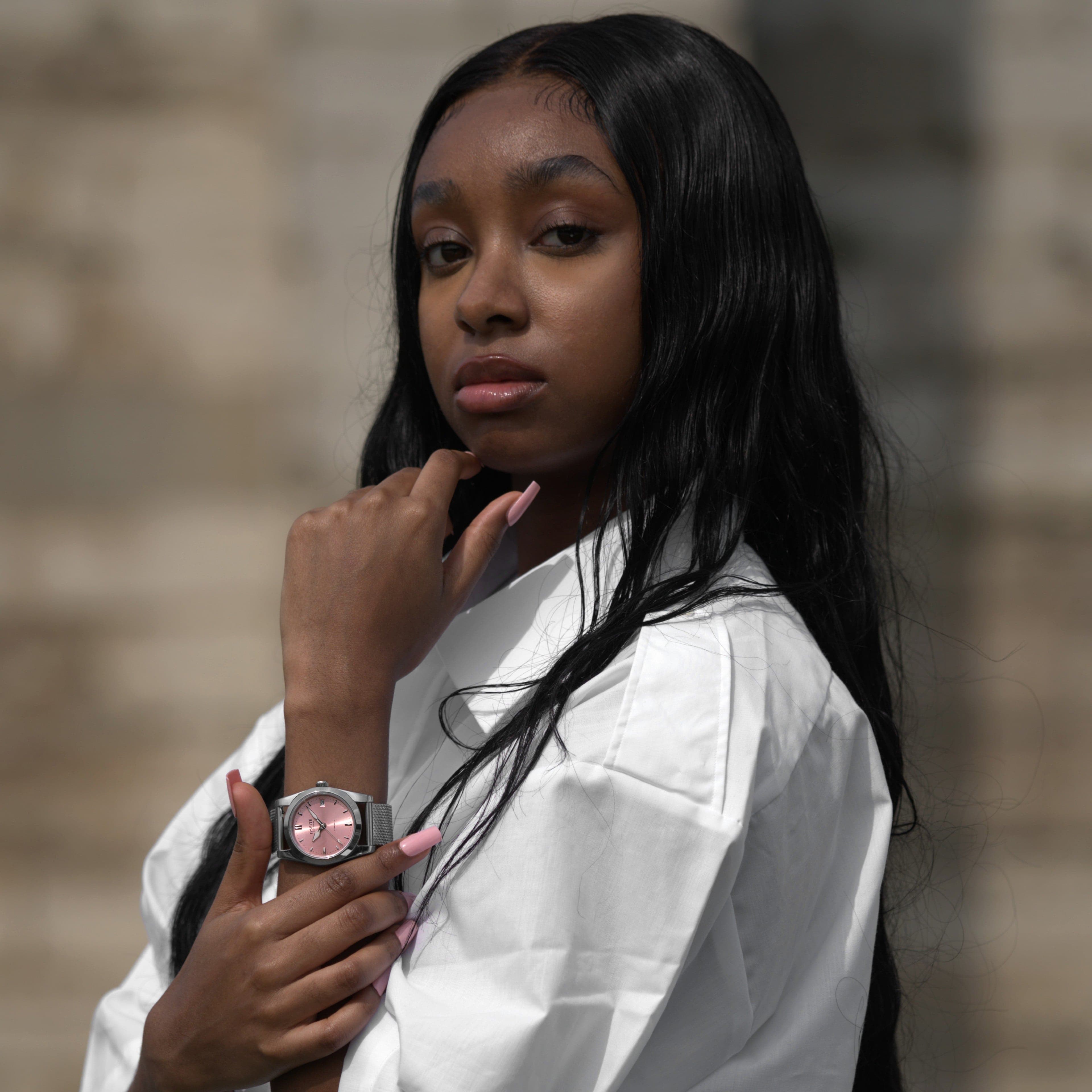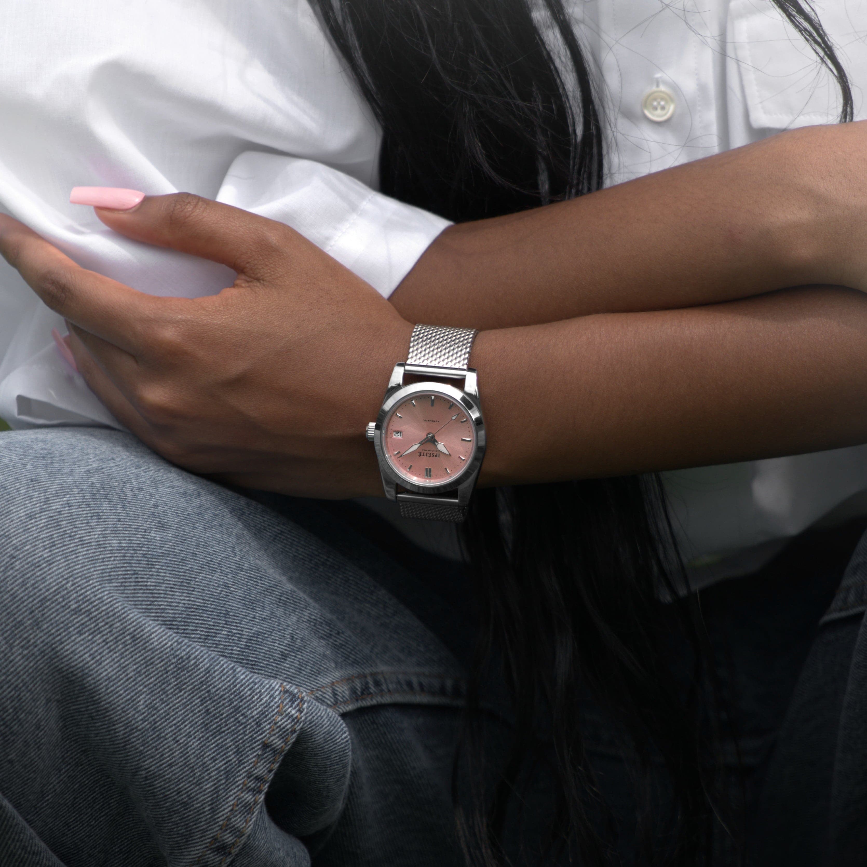 DISTINCTION ローズは、希少で上品なピンクのサンバースト文字盤によって際立っています。36mmの316Lステンレススチールケースは、ポリッシュ加工と堅牢性を兼ね備え、現代性と時代を超えた魅力の完璧なバランスを提供します。